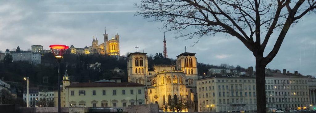 Un petit tour sur le parvis de Fourvière où nous pouvons déguster chocolat ou vin chauds. Il faut reprendre des forces car bientôt nous dégringolons les 500 marches qui nous conduisent sur la place Saint-Paul pour y découvrir l’église. Par la passerelle Saint-Vincent nous rejoignons la presqu’île via de la place des Terreaux puis l’église Saint-Nizier. Déjà il fait nuit.
